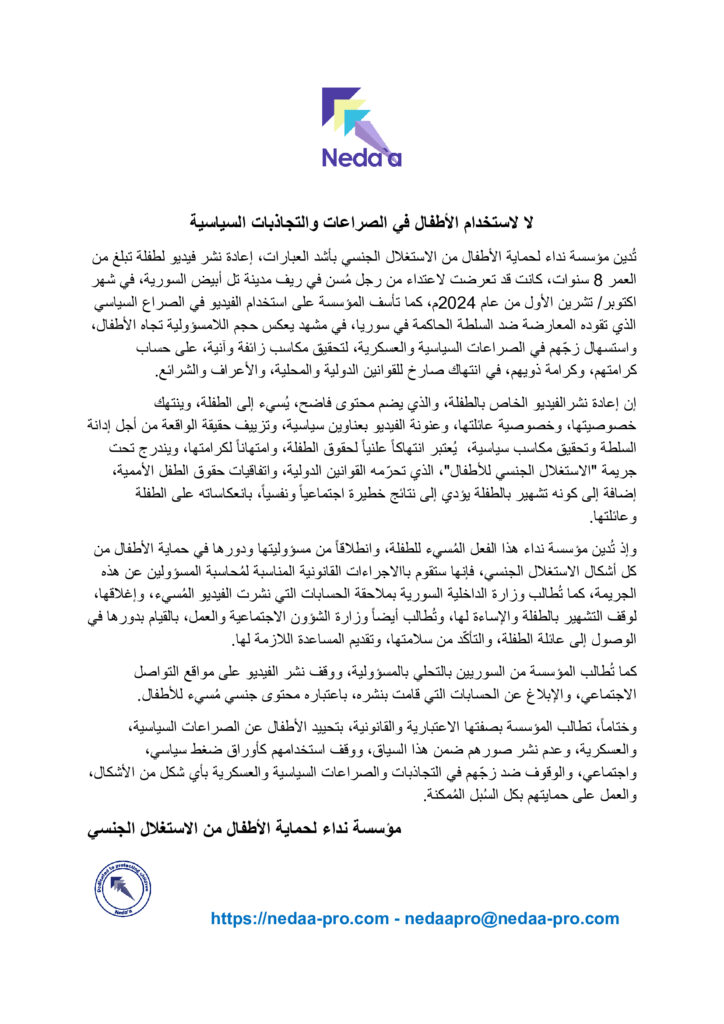أغسطس 4, 2025تُدين مؤسسة نداء لحماية الأطفال من الاستغلال الجنسي بأشد العبارات، إعادة نشر فيديو لطفلة تبلغ من العمر 8 سنوات، كانت…